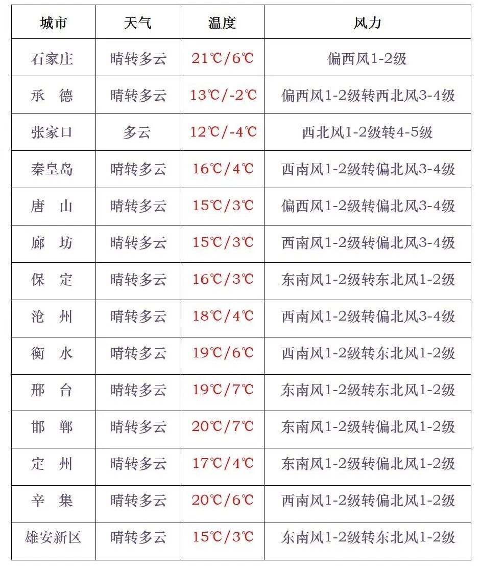 【强冷空气发力】明后两天早晨,北部地区和西部山区局地下降10~14℃,其他地区最低气温下降5~9℃。今天(11月15日)白天,张家口北部、承德北部多云转阴,其他地区晴。石家庄今天晴转多云,6°C~21°C;雄安新区晴转多云,3°C~15°C;北京晴,4°C~14°C。、