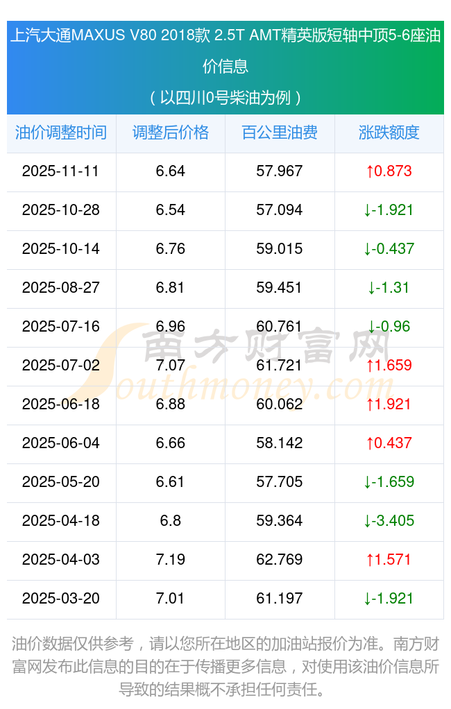 本轮油价的调整时间为11月11日,调整后全国92号汽油平均价格为7元每升,其中,最低为陕西的6.83元/升,最高为海南的8.06元/升。全国95号汽油平均价格为7元每升,其中,最低为陕西的7.22元/升,最高为海南的8.55元/升。全国0号柴油平均价格为:7元每升,其中