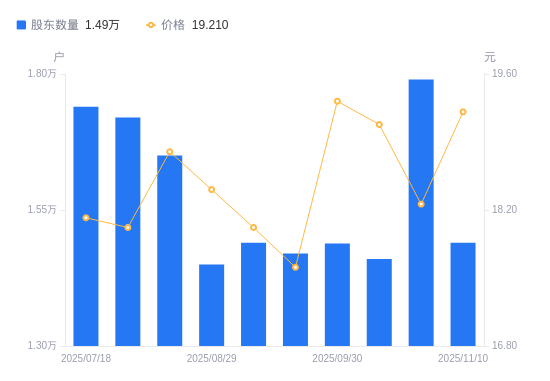 近一年(2024年11月20日至2025年11月10日),英可瑞A股股东户数从1.96万户,减低至1.49万户,降幅24.12%,区间股价上涨1.11%。