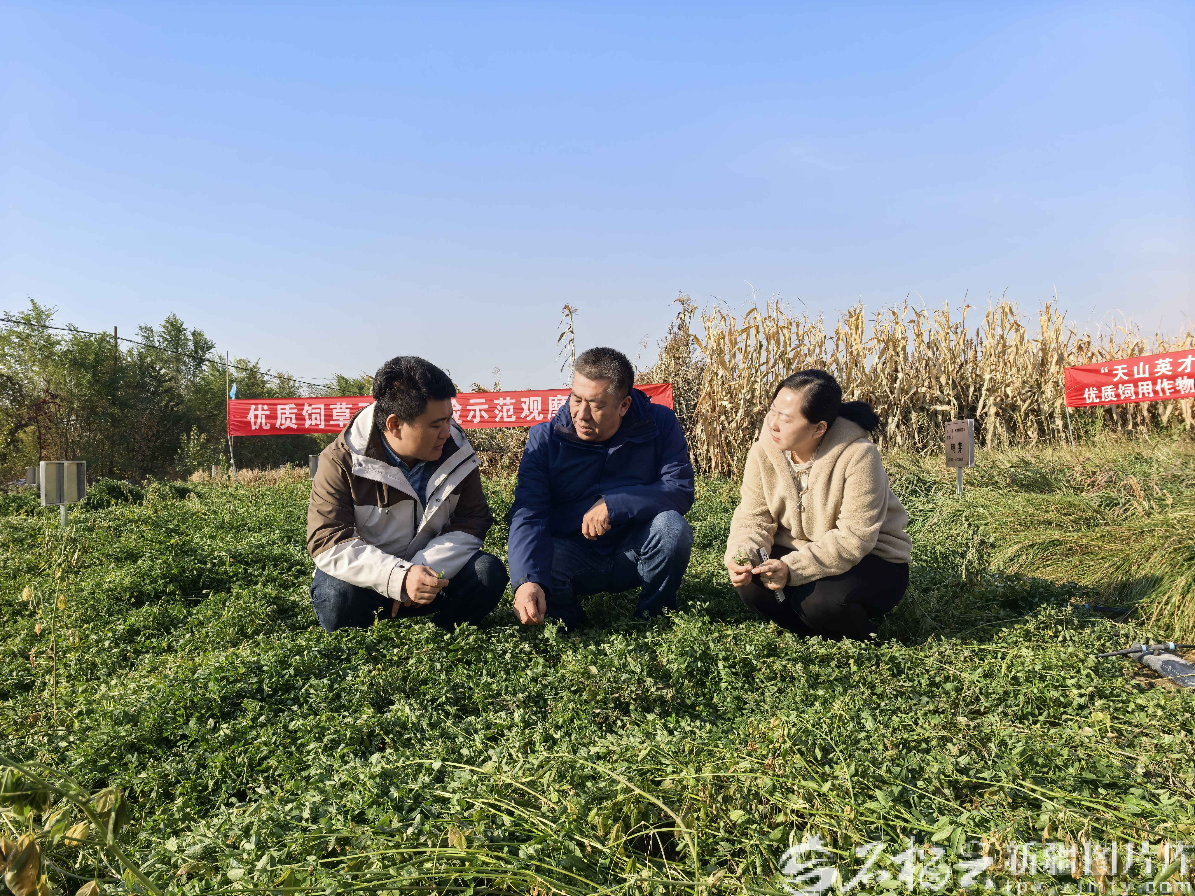 自治区优质饲草产业技术体系的岗位专家们正在示范田里讨论。石榴云/新疆日报记者 马帛宇摄