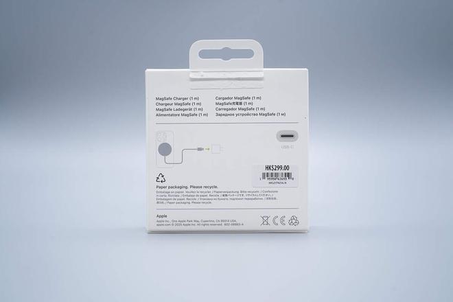 港版MagSafe无线充电器采用白色包装盒,盒子右上角印有苹果logo,MagSafe Charger和产品外观图,整体简约。